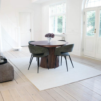 Den runde bordplade og de lodrette lameller er en populær kombination, som giver et eksklusivt udtryk. Spisebordet har en lakeret overflade.