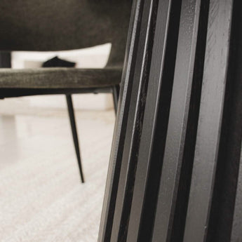 Den runde bordplade og de lodrette lameller er en populær kombination, som giver et eksklusivt udtryk. Spisebordet har en lakeret overflade.