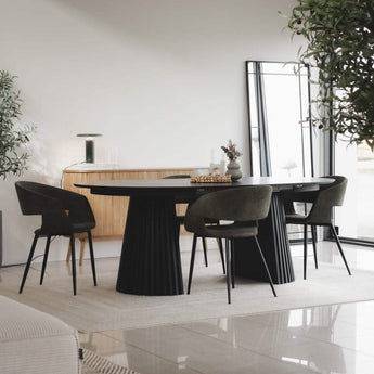 Runde spiseborde kan noget helt specielt i boligen. Det runde spisebord med den sort bejdset farve indbyder til samvær, med plads til hele familien. Måne Lamel Spisebord med tillægsplader kan nemlig blive helt op til 210 cm. Monter nemt én eller to tillægsplader alt efter behov og få plads til det hele.