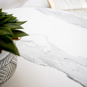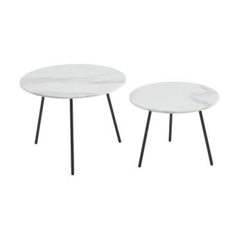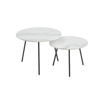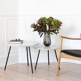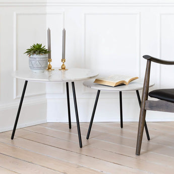 Super flot og eneklt sofabordsæt, med en flot hvid keramik bordplade. Bordene er super smarte, da de kan bruges på flere forskellige måder. Brug dem som hjørnebord hver for sig, med en lampe eller plante for at skabe hygge, eller brug to ved siden af hinaden for et mere fleksibelt sofabord. Højde forskellen på bordene gør også, at du let kan "skubbe" det lave bord lidt under, for mere plads.