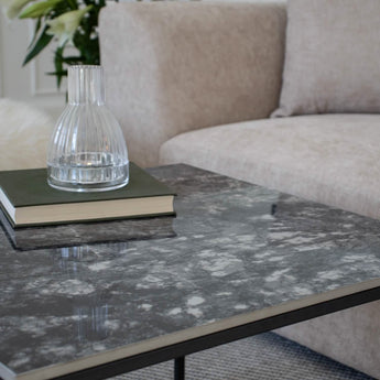 Super flot og enkelt hjørnebord med en flot beige keramik bordplade. Hjørnebordene er super smarte, da de kan bruges på flere forskellige måder. Brug dem som hjørnebord, med en lampe eller plante for at skabe hygge, eller brug to ved siden af hinaden for et mere fleksibelt sofabord.