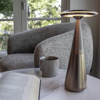 Nyhed hos Hofstra & Wagner. Genopladelig bordlampe i et flot design. Lampen findes i forskellige farver og varianter. Forestil dig at kunne skabe enhver stemning med blot et tryk. Med Juri Bordlampen kan du skifte mellem 3 lys øverst på lampen og samtidig styre lysstyrken efter dine behov og ønsker.