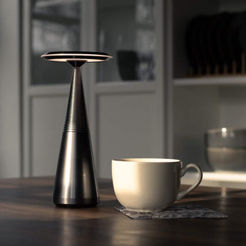 Nyhed hos Hofstra & Wagner. Genopladelig bordlampe i et flot design. Lampen findes i forskellige farver og varianter. Forestil dig at kunne skabe enhver stemning med blot et tryk. Med Juri Bordlampen kan du skifte mellem 3 lys øverst på lampen og samtidig styre lysstyrken efter dine behov og ønsker.