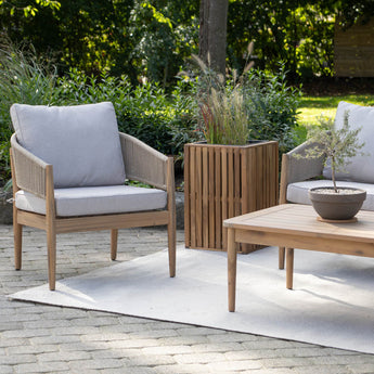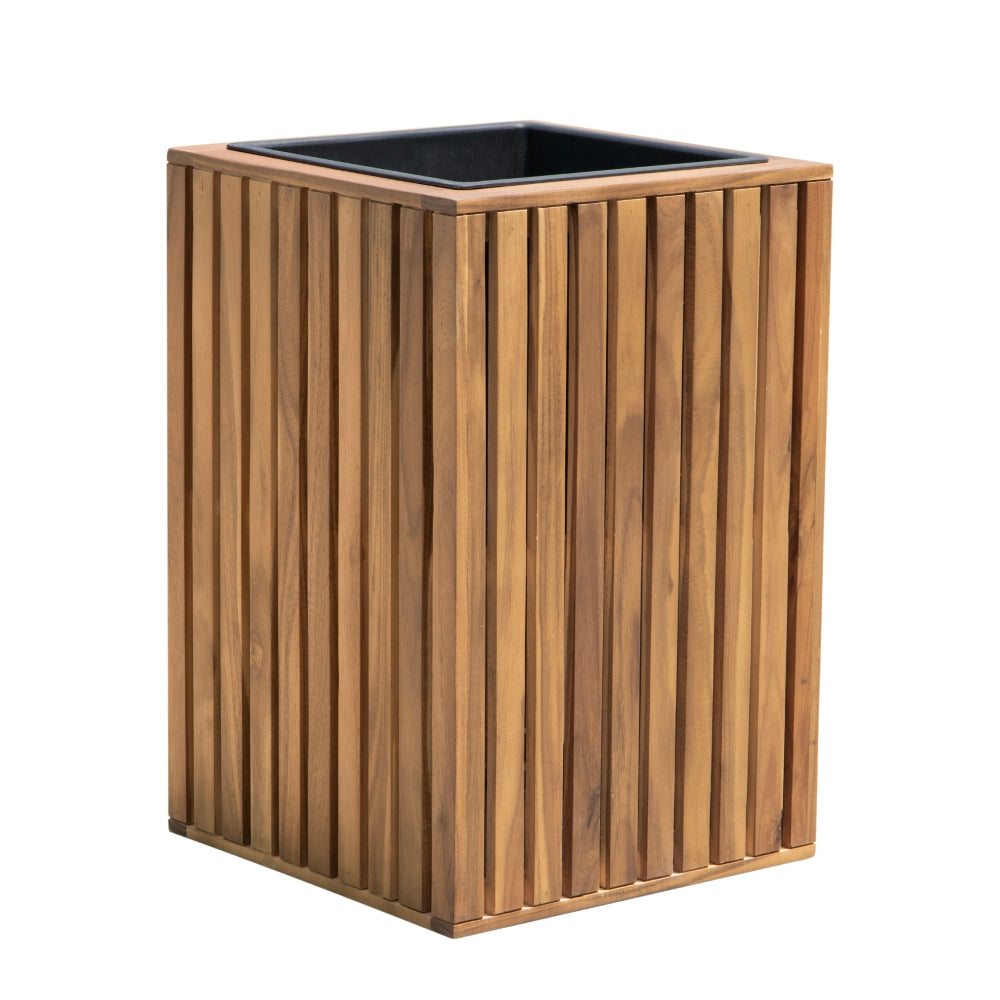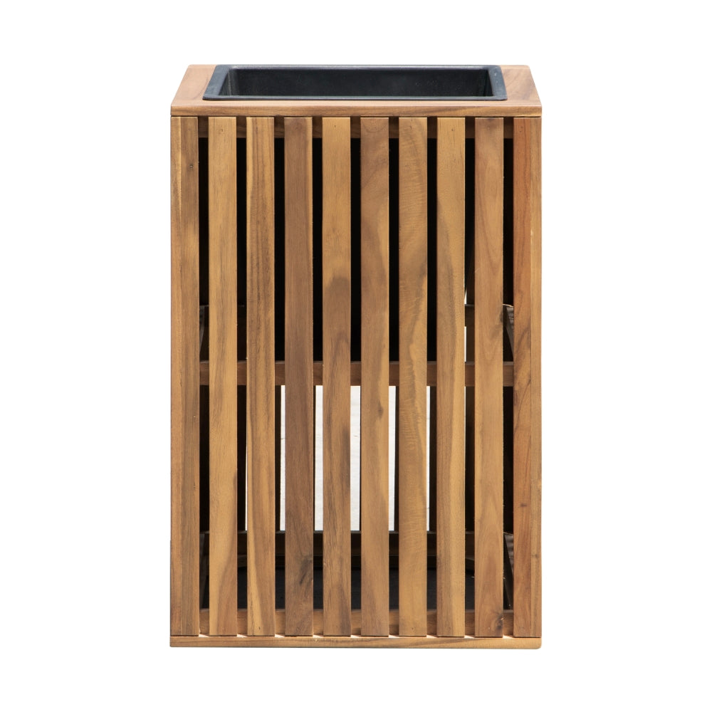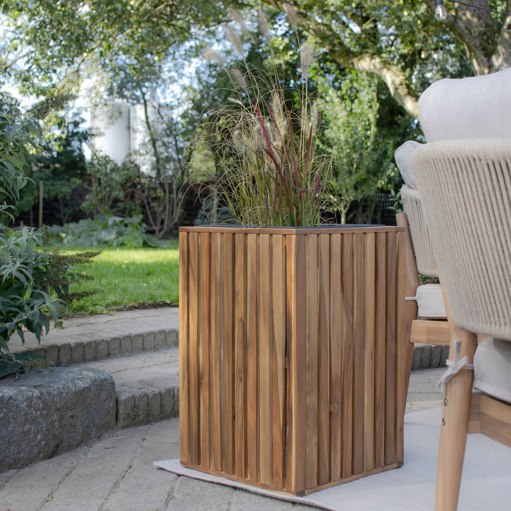 Akacietræet giver plantekassen en stabil og robust konstruktion, samtidig med at den bevarer et naturligt udtryk. De lodrette trælameller gør designet let og enkelt uden at virke råt eller industrielt.