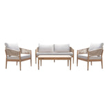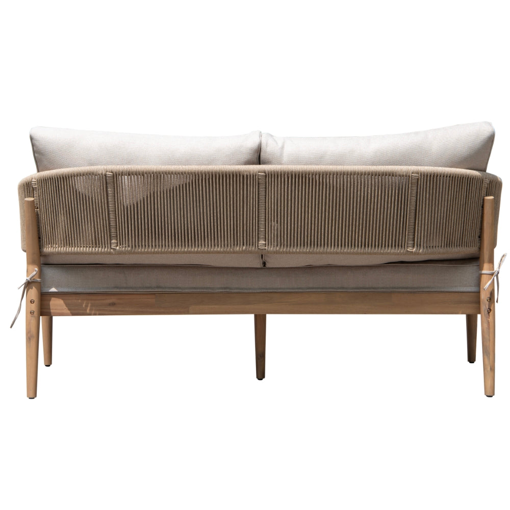 Solheim 4-pers. loungesæt med beige skibsreb er en smuk tilføjelse til din have, terrasse eller et helt andet sted hvor du synes det passer ind. Træværket på loungesættet er i massiv akacietræ, hvilket gør det utrolig holdbar, derudover er det viklet indviklet i lys reb, som er uv- og vejrbestandigt.