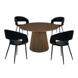 Et super flot rundt spisebordssæt sammensat af Måne Lamel Spisebord og Nilo Spisebordsstole. Det runde spisebord i farven smoked indbyder til samvær. De lodrette lameller og de elegante spisebordsstole i sort PU skaber det perfekte spisebordssæt.