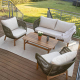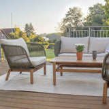 Tokheim 4-pers. loungesæt med grøn skibsreb er en smuk tilføjelse til din have, terrasse eller et helt andet sted hvor du synes det passer ind. Træværket på loungesættet er i massiv akacietræ, hvilket gør det utrolig holdbar, derudover er det viklet indviklet i lys reb, som er uv- og vejrbestandigt.