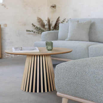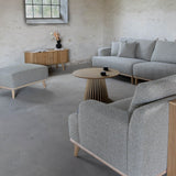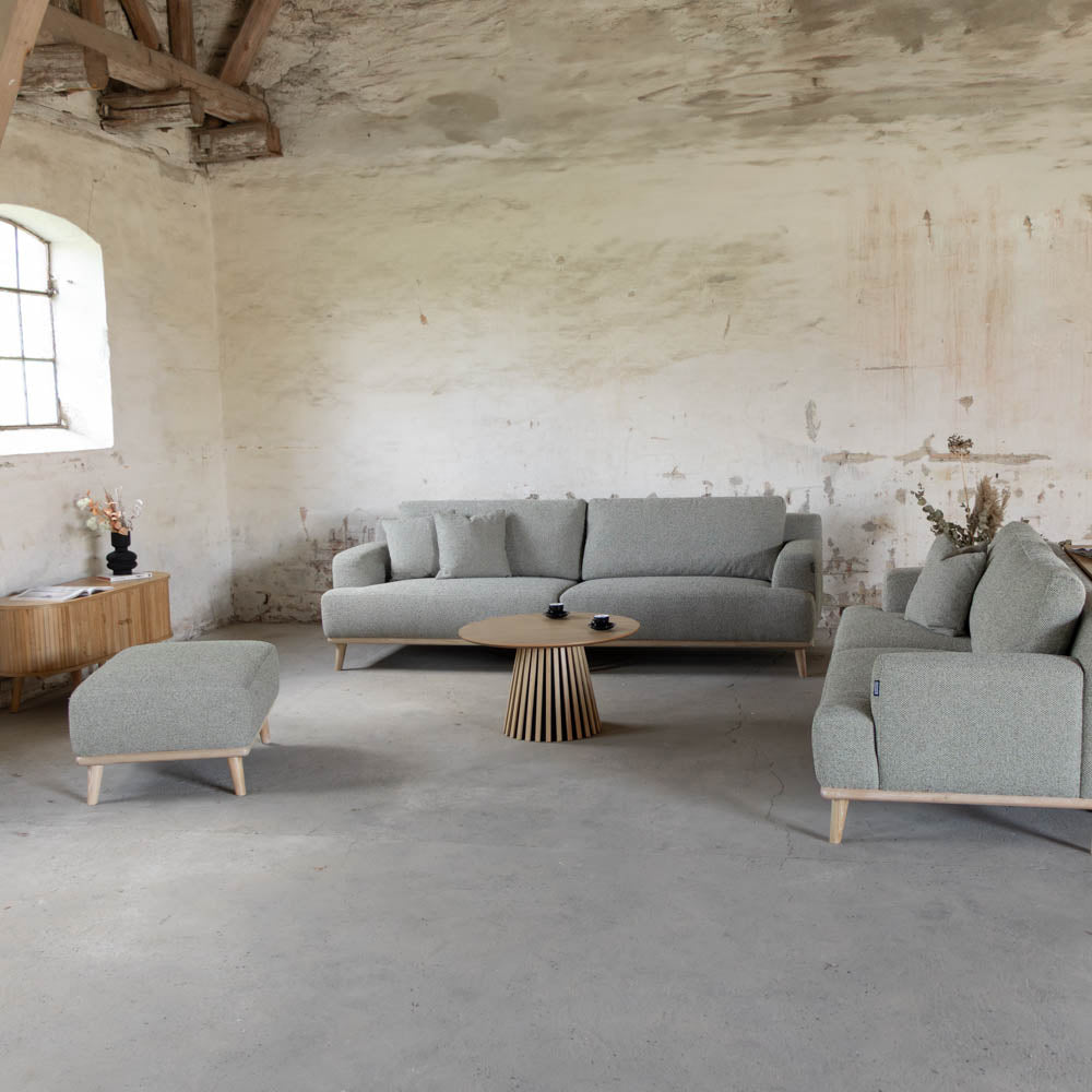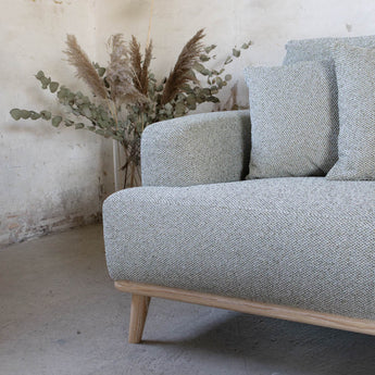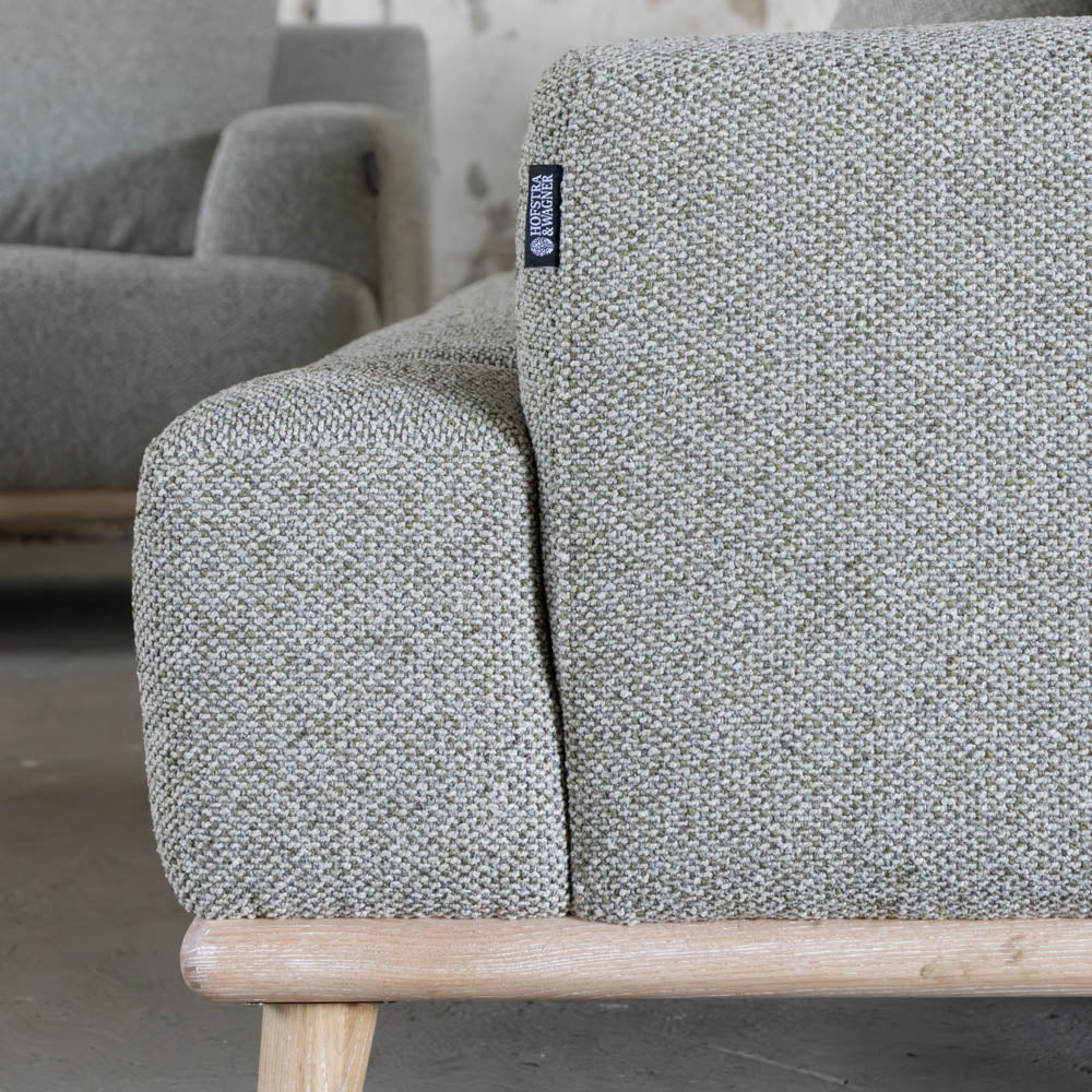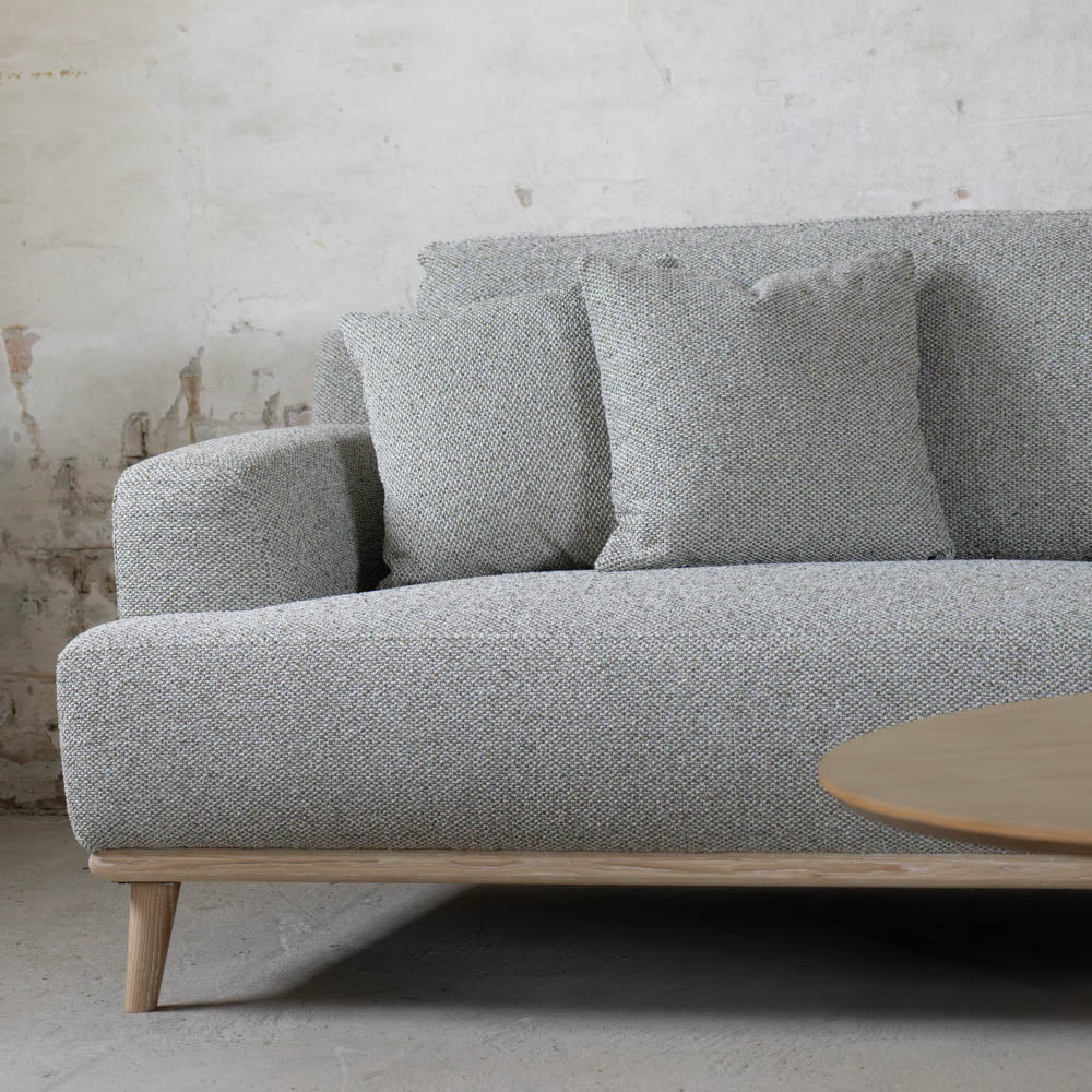 Trærammen med de lyse ben giver en flot kontrast til betrækket, og giver både sofaen og rummet et naturligt og lyst udtryk.