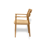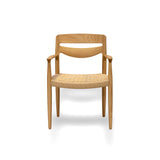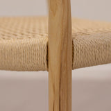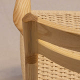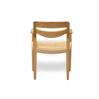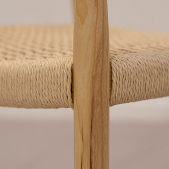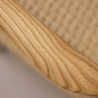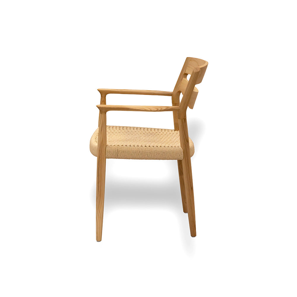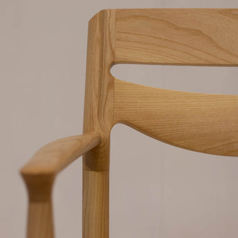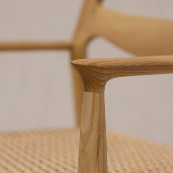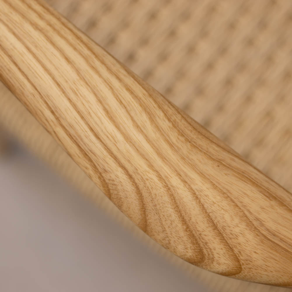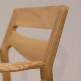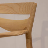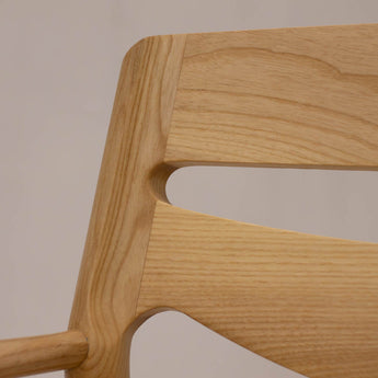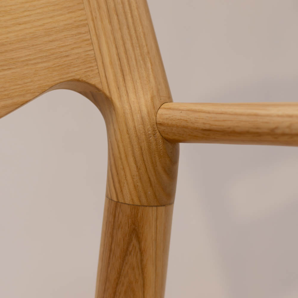 Ryglænet er designet med fin bredde for optimal støtte, men letheden bevares gennem hullet mellem ryg og sæde – en detalje, der tilføjer både luft og elegance. De blødt afrundede kanter og den præcise samling mellem ben og ryg afslører en dyb respekt for snedkerhåndværket.