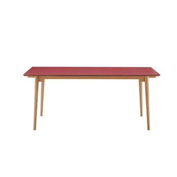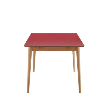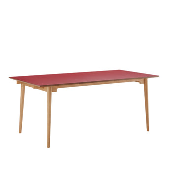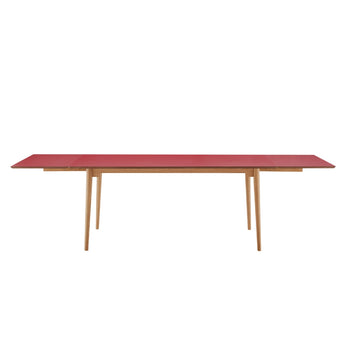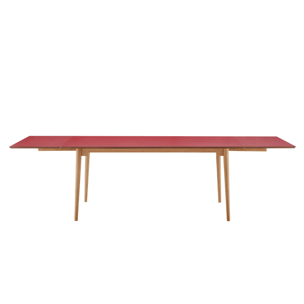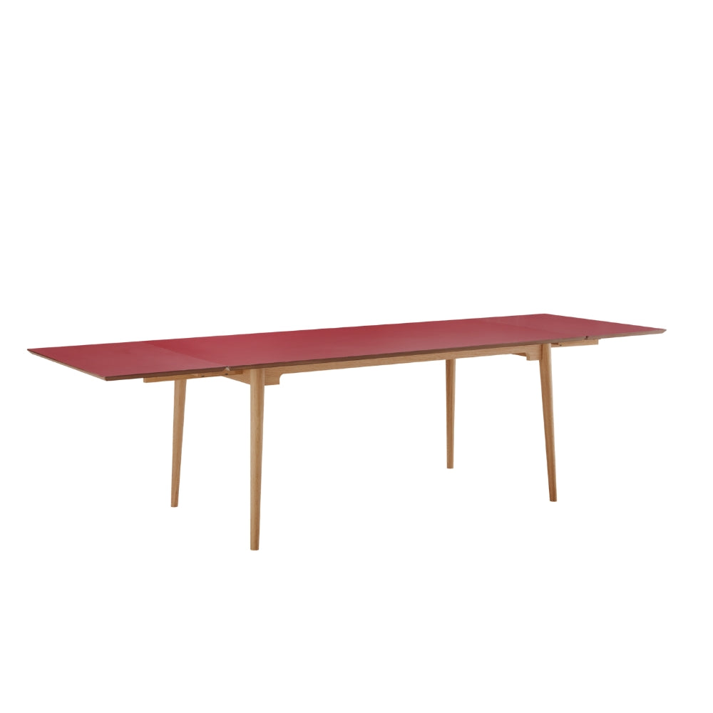 Flot og elegant spisebord med egetræs ben og en bordeaux HPL bordplade. Spisebordet giver et eksklusivt udtryk og tilføjer lidt farve til hverdagen. Bordet er med mulighed for forlængelse via to tillægsplader, så der er plads til op til 4 stole pr. langside.
