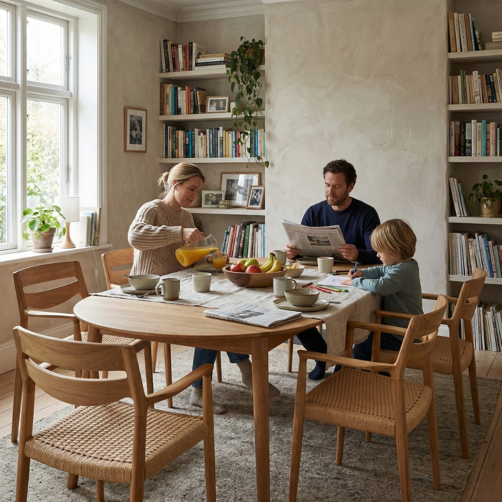 Ryglænet er designet med fin bredde for optimal støtte, men letheden bevares gennem hullet mellem ryg og sæde – en detalje, der tilføjer både luft og elegance. De blødt afrundede kanter og den præcise samling mellem ben og ryg afslører en dyb respekt for snedkerhåndværket.