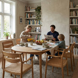 Yra spisebordsstol forener klassisk håndværk med et nutidigt formsprog. Fremstillet i massiv ask fremstår stolen lys og naturlig med smukke åretegninger, der understreger materialets ægthed. Det håndflettede sæde giver et varmt, taktilt modspil til det rene træ og sikrer god siddekomfort.