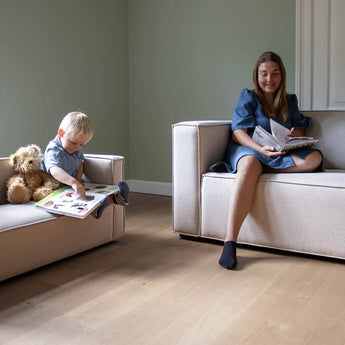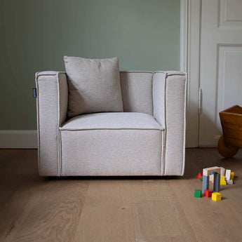 Den giver børnene deres helt eget sted at slappe af, læse en bog eller se en film. Med bløde former, robuste materialer og en siddehøjde tilpasset små kroppe, er den både sikker og indbydende.