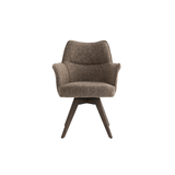Stolen er betrukket med et smukt, meleret boucle-stof i en brun farve, som ikke blot tilføjet et eksklusivt look til stolen, men også en spændende struktur. Meleringen skaber et farvespil der gør at den passer ind i både lyse og mørkere indretningen, samtidig med at det gør det yderst praktisk overfor hverdagens brug.