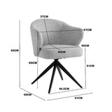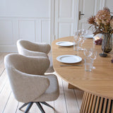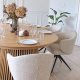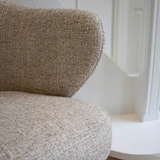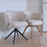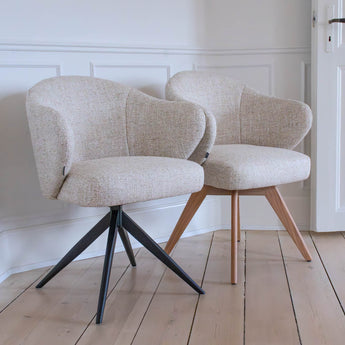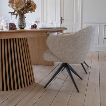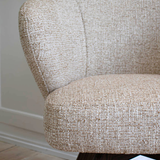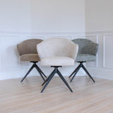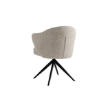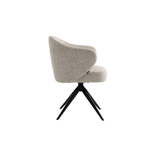 Stolen er betrukket med et smukt, meleret boucle-stof i en varm beige farve. Stoffets struktur tilføjer noget liv og tekstur til stolen. De sorte metal ben skaber en flot kontrast til det lyse sæde. De slanke ben giver stolen et let udtryk, som kontrast til det rummelige sæde. Stolen har drejefunktion, hvilket gør det nemt at komme ind og ud af bordet.