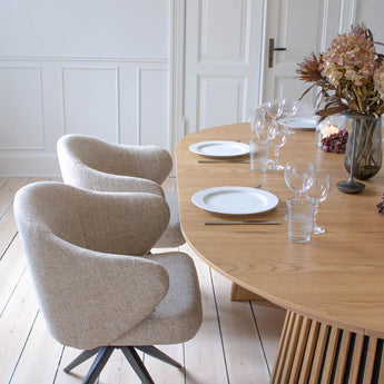 De blødt afrundede armlæn samt den gode polstring i både sæde og ryg sikrer en høj siddekomfort som gør den yderst behagelig at sidde og uanset om det er til kaffetid eller middagsselskab. Armlænets runding er ikke blot et praktisk sted, hvor armene kan hvile - det skaber også en stol der er smuk fra alle vinkler.