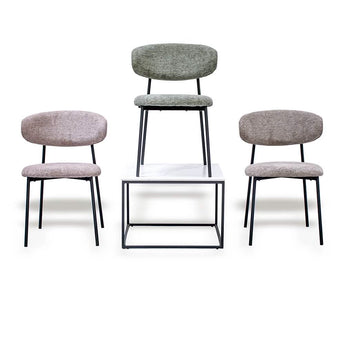 Ryglænet er let afrundet og formet, så det nærmest giver dig et lille kram, når du sætter dig – en subtil detalje, der gør en stor forskel i hverdagen. Den smukke kontrast mellem det polstrede sæde og det rå stel skaber et levende spil i indretningen og giver stolen karakter uden at virke tung. Sædet er formet således at det er bredest fortil og smaller let ind bagtil.
