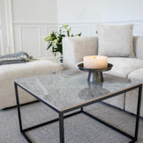 Super flot og enkelt hjørnebord med en flot beige keramik bordplade. Hjørnebordene er super smarte, da de kan bruges på flere forskellige måder. Brug dem som hjørnebord, med en lampe eller plante for at skabe hygge, eller brug to ved siden af hinaden for et mere fleksibelt sofabord.