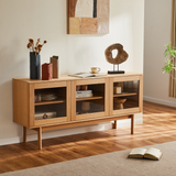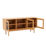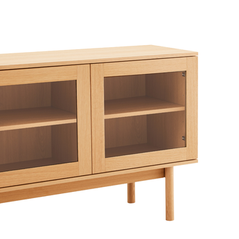 Stilren skænk med elegante glaslåger, der giver et let og eksklusivt udtryk. Det tidløse design passer perfekt ind i både stue og spisestue, og kombinerer funktionel opbevaring med et moderne look.