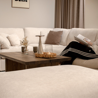 Med sit modulopbyggede design kan sofaen nemt tilpasses efter behov, og den medfølgende puf fungerer både som fodskammel, ekstra siddeplads eller en naturlig forlængelse af sædet – perfekt til afslapning.