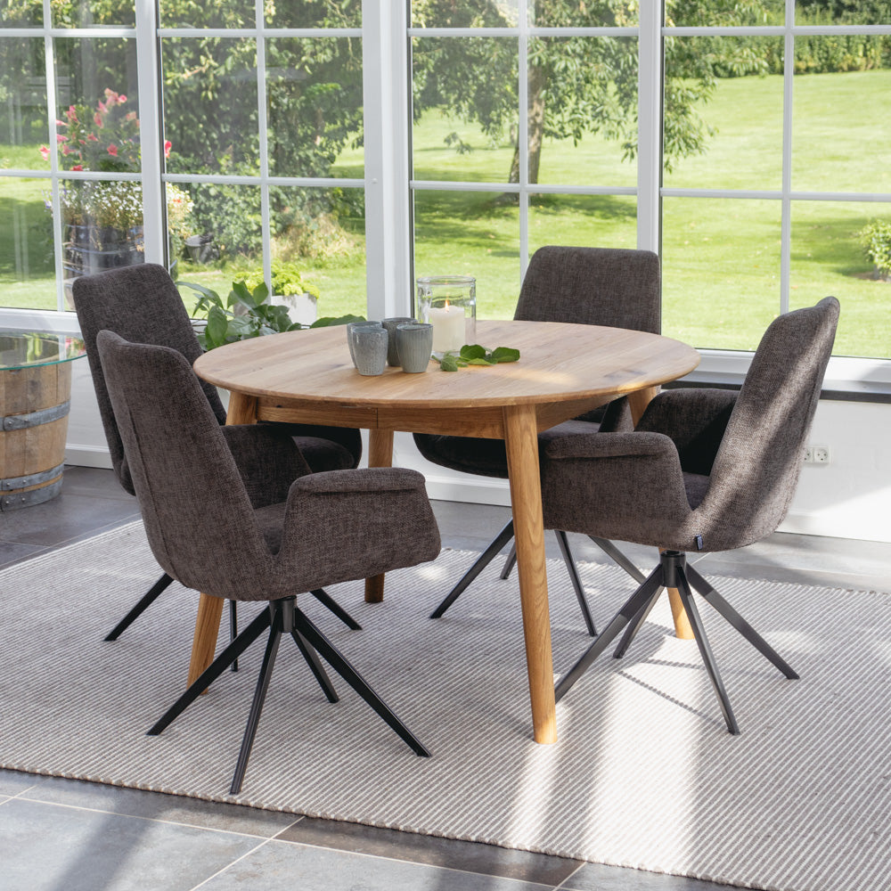 Flot rundt spisebord i naturolieret egetræ med mulighed for to tillægsplader. Bordet er enkelt og stilrent, som kan anvendes sammen med vores flotte og komfortable spisebordsstole.
